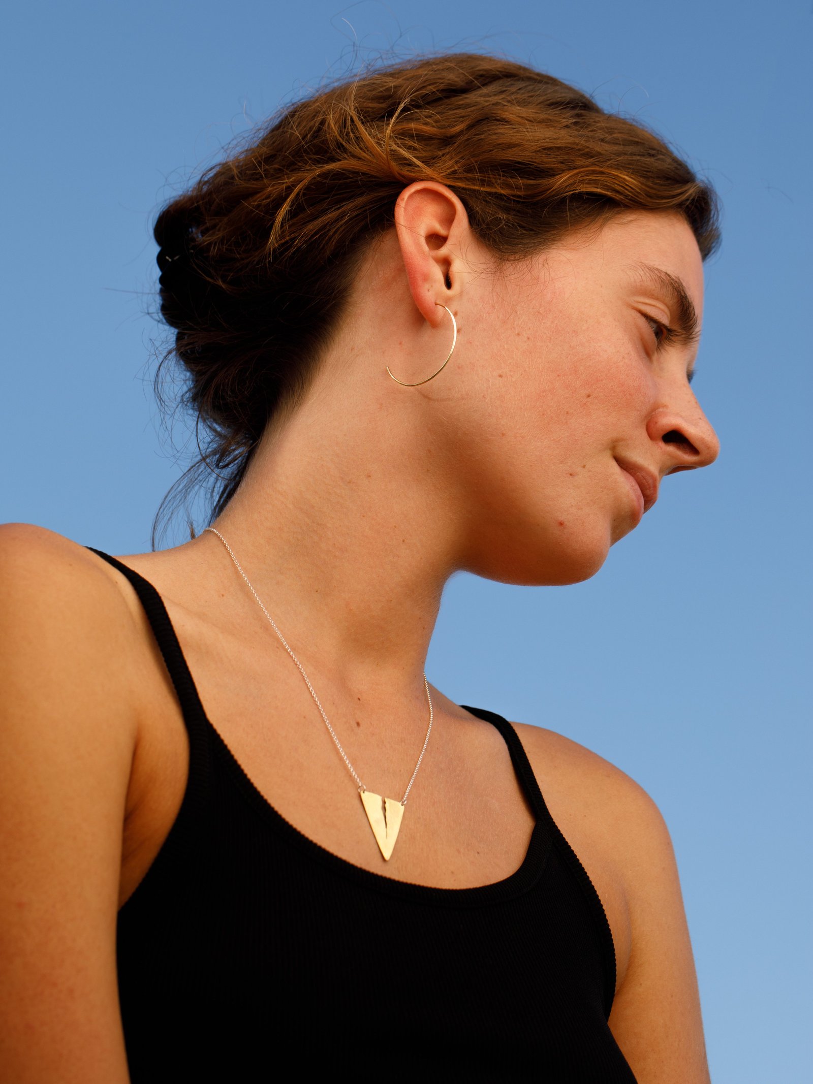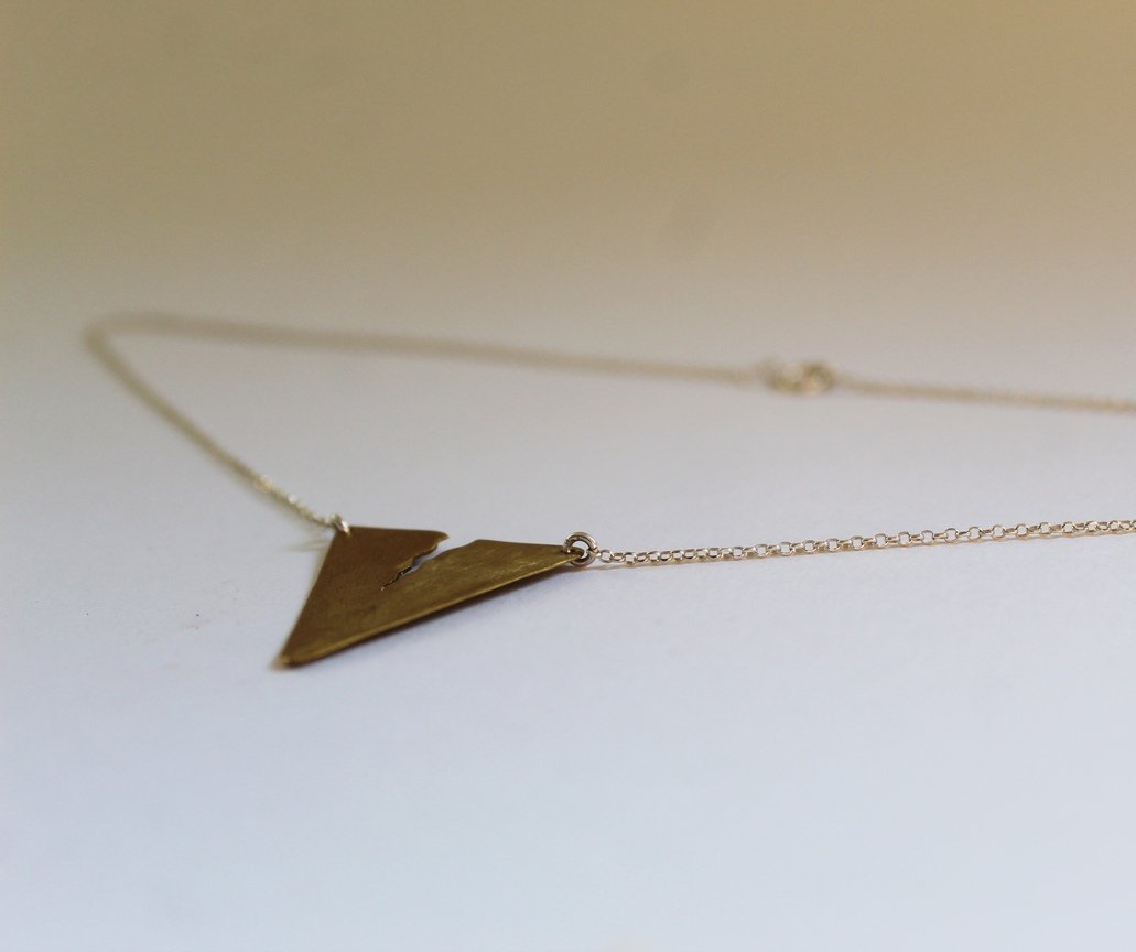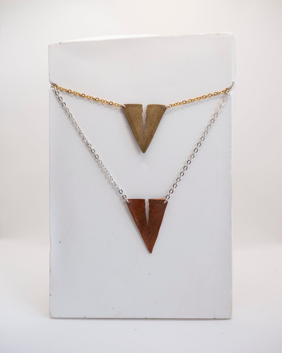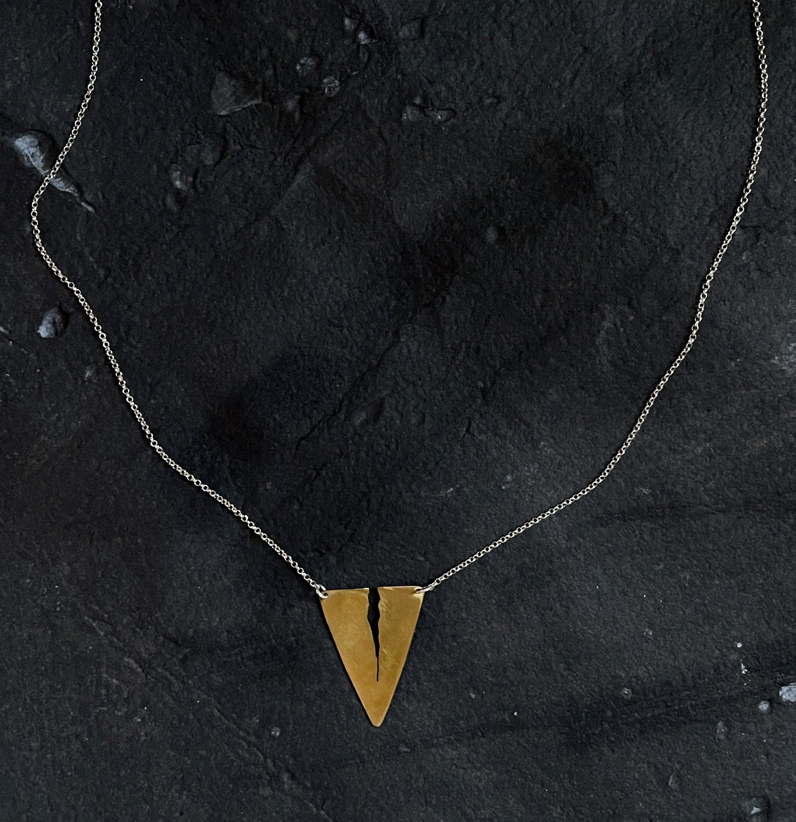 Una fisura que rompe la perfección, un símbolo de resiliencia y transformación. Este collar de latón, con su forma triangular y su hendidura marcada, representa la belleza de lo imperfecto, la historia que llevamos en nuestra piel y el poder de renacer tras la fractura.