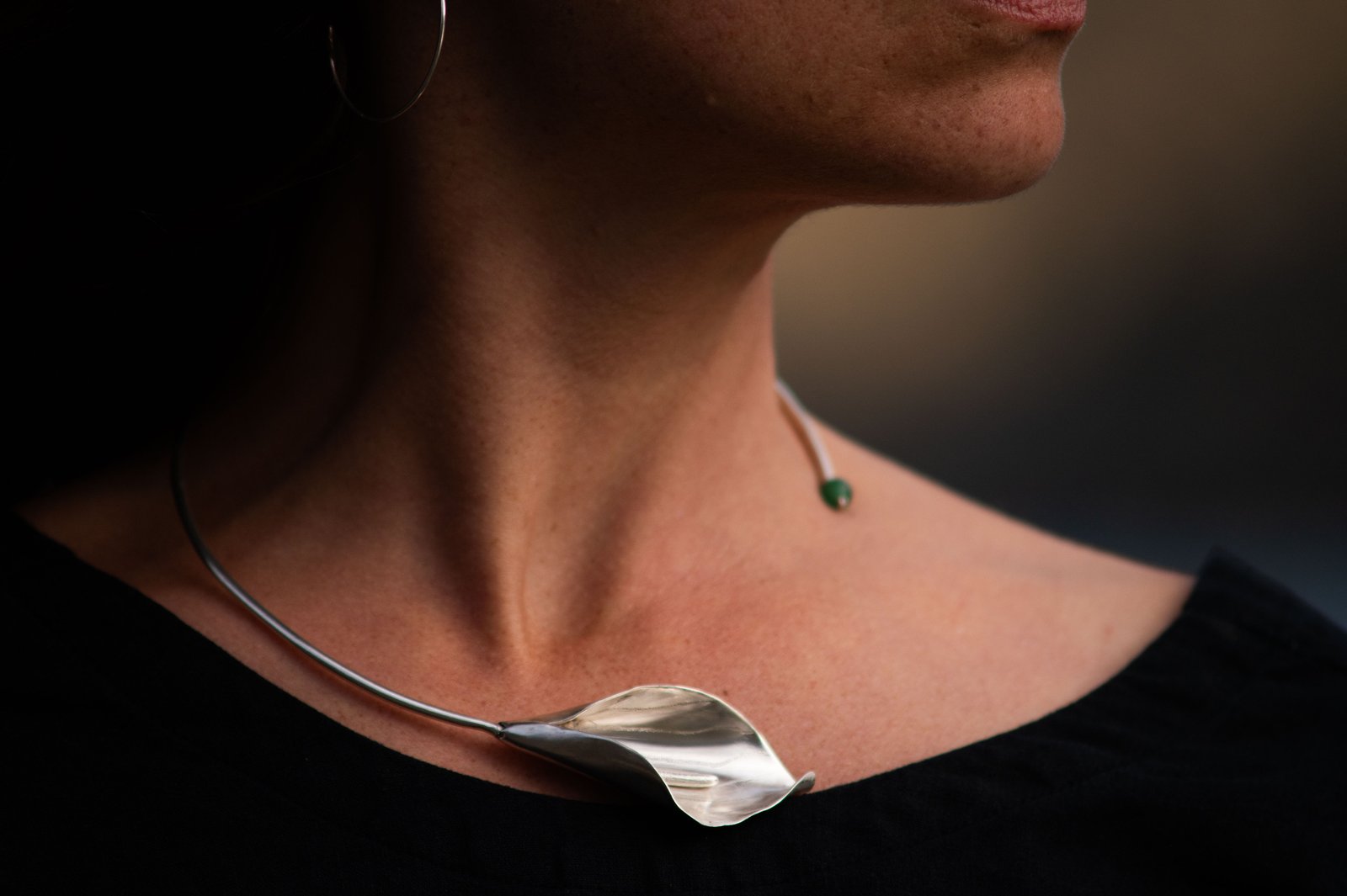 Inspirado en la delicadeza de la flor de cala, este collar artesanal captura la elegancia y la armonía de la naturaleza. La suavidad de sus curvas en plata representa la pureza y la feminidad, mientras que el jade verde añade un sutil toque de frescura y vitalidad.