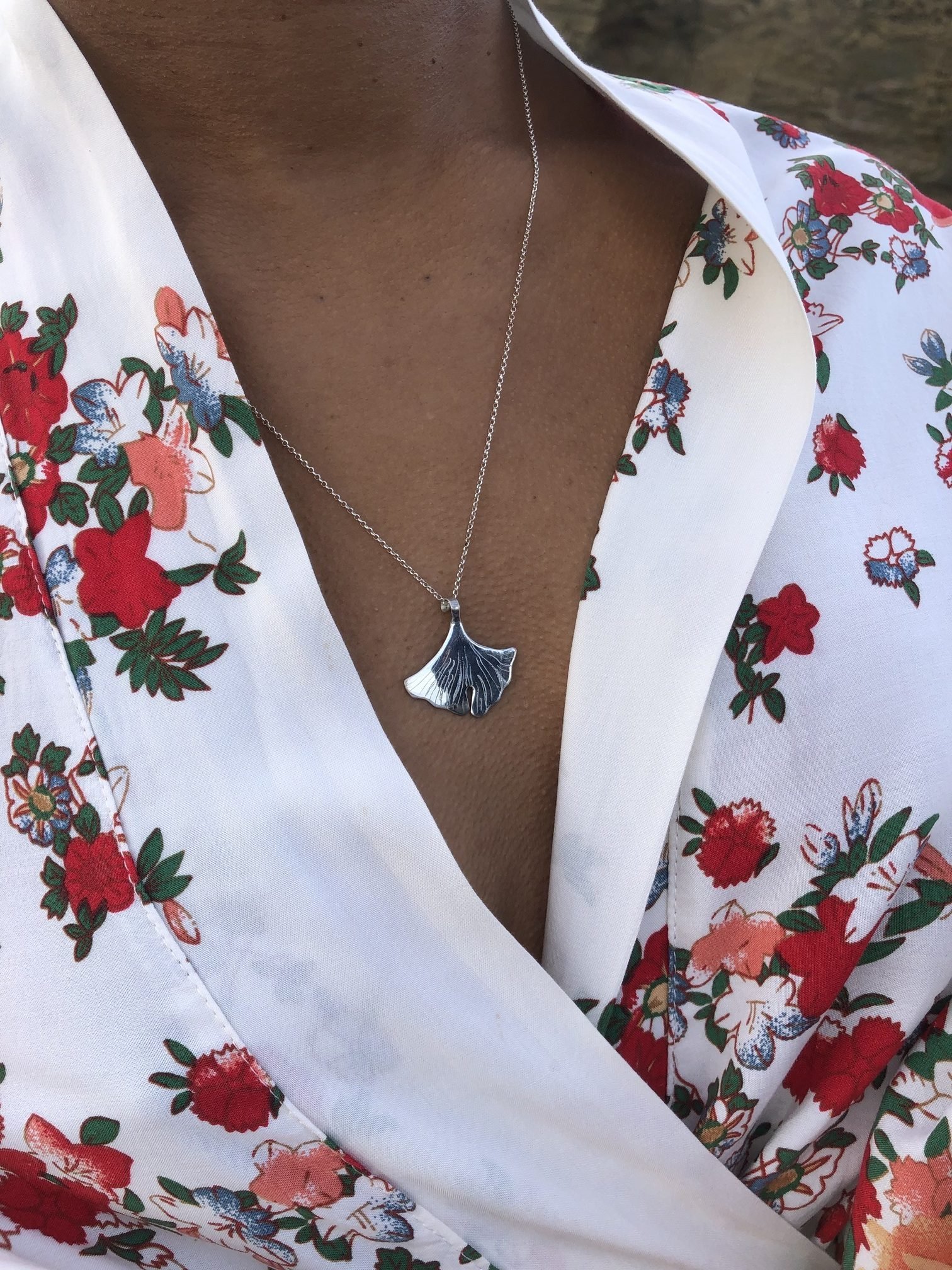 Inspirado en la hoja del árbol de ginkgo, este collar de plata simboliza la resiliencia, la longevidad y la conexión con la naturaleza. Su forma orgánica y sus delicados detalles evocan el fluir del tiempo y la belleza efímera de cada estación.